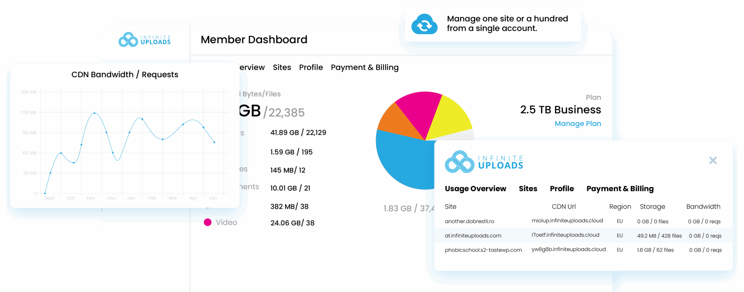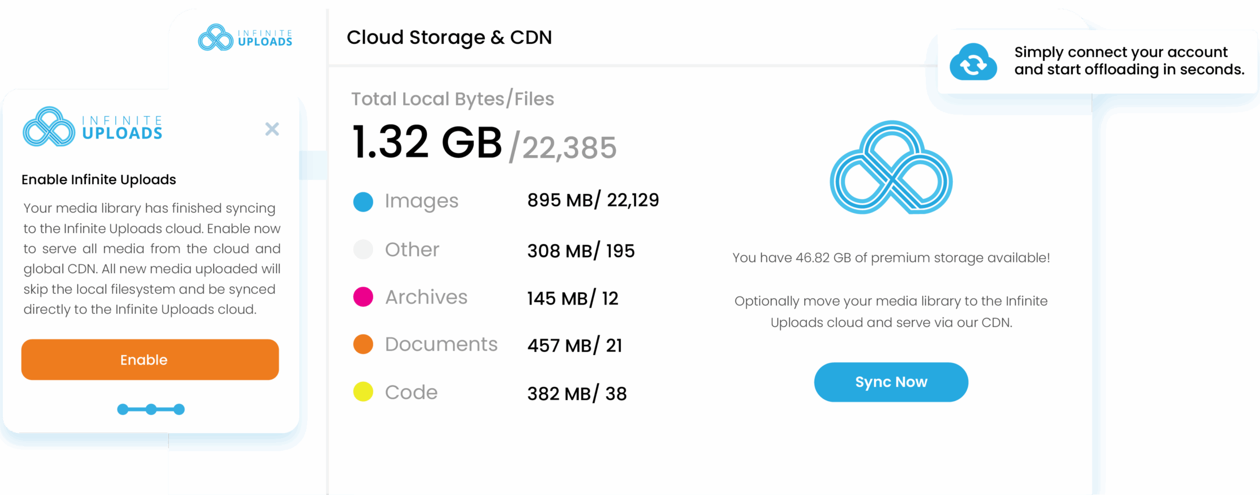 Infinite Uploads is the only true all-in-one cloud storage solution for WordPress. Unlike any other platforms, Infinite Uploads handles both offloading and cloud storage for you. You don't need to use any 3rd-party utility plugins or go through the complex setup and maintenance.
