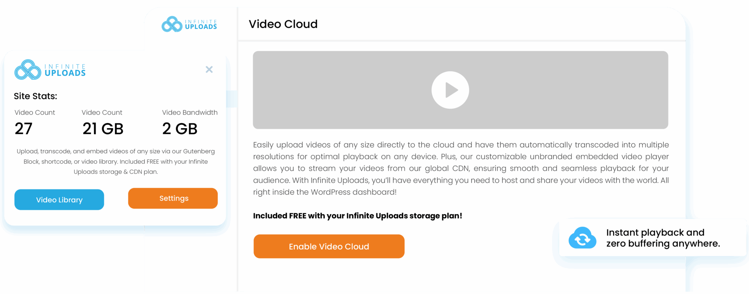 Upload any size video directly to WordPress without timeouts or errors. Infinite Uploads stores, encodes, and streams everything through the cloud for smooth playback and faster delivery everywhere.